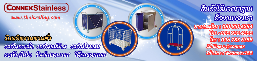 | โรงงานผู้ผลิตและจำหน่าย รถเข็น, รถเข็นโรงแรม, รถเข็นบันได, บันได, รถเข็นแม่บ้าน, รถเข็นผ้า, รถเข็นโรงงาน, รถเข็นของ, รถเข็นสองล้อ (หลังโค้ง/หลังตรง), รถเข็บเก็บผ้า, อุปกรณ์โรงแรม, รถเข็บพับเก็บได้, รถเข็นสำนักงาน, รถเข็นสแตนเลส, รถเข็นเอกสาร, รถเข็นของ, พาเลท Shop/Sale Trolley, Cart, Hand Truck, Trolley Stainless Steel สินค้ายี่ห้อคอนเน็กซ์ |
